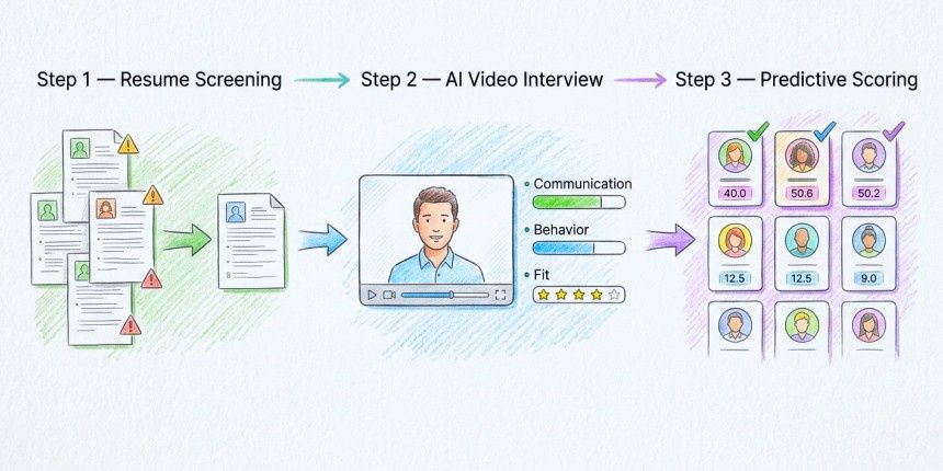 Candidates who pass the resume check have structured video interviews. They get the same questions and follow-ups. Hyring’s AI video interviewer looks at their communication skills, behavior, and answer quality, giving scores and transcripts for recruiters to review.
