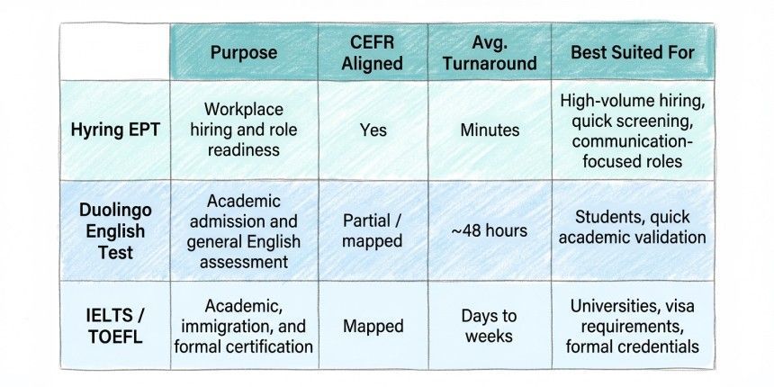 For workplace-specific roles, AI-powered tools like Hyring's EPT are the strongest fit: CEFR-aligned, built for professional communication, and designed to slot into existing screening workflows without adding friction. IELTS and TOEFL serve a different purpose and work best where formal certification is required.