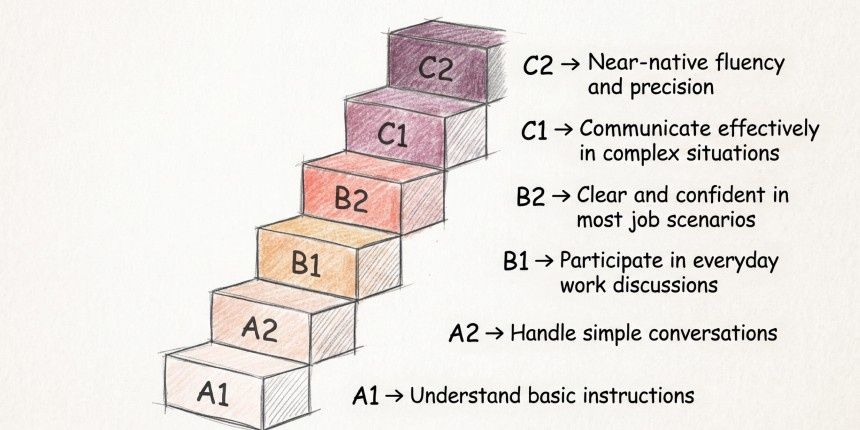 The CEFR framework, published by the Council of Europe, runs from A1 through C2 and is recognized by schools, employers, and governments across the world. A CEFR level means the same thing in Singapore as it does in Germany or Canada, which makes it genuinely useful for global hiring.