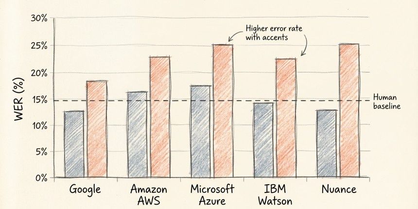 Accent handling is the harder problem. A 2020 PNAS study by Koenecke et al. tested five major commercial ASR systems and found that error rates for African American Vernacular English speakers were more than double those for white speakers. The cause is not mysterious: a model trained mostly on one type of speech will not perform equally on others. For hiring tools, that is a serious concern. A candidate with a South Indian, Nigerian, or Brazilian accent might score lower on pronunciation, not because they are hard to understand, but because the model was not built with their phonetic patterns in mind.