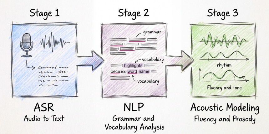 It starts with automatic speech recognition, or ASR, which converts spoken audio into text. Not just the words either, it picks up pauses, timing, and phonetic detail that a basic transcript would flatten. From there, natural language processing reads through that text and checks grammar, vocabulary, and whether the ideas connect logically. A third component, acoustic modeling, listens for rhythm and stress in the voice. That last piece matters because fluency is not just about word choice. It shows up in how someone moves through a sentence.