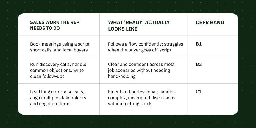 It depends on the role. For most customer-facing positions, you need a rep who can run discovery, handle objections, and write clear follow-ups independently, without a manager cleaning up their communication. That typically maps to an independent, job-ready level rather than basic conversational ability. For enterprise roles with longer sales cycles and senior stakeholders, the bar is higher.