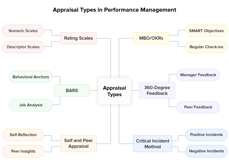 Some common ones are 360-degree feedback, management by objectives (MBO), self-assessment, rating scales, and behaviorally anchored rating scales (BARS). All these methods examine performance in various dimensions to provide an overall picture.