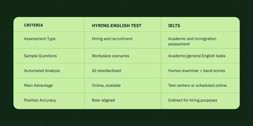 - The Hyring English Test vs IELTS comparison comes down to purpose, not quality.