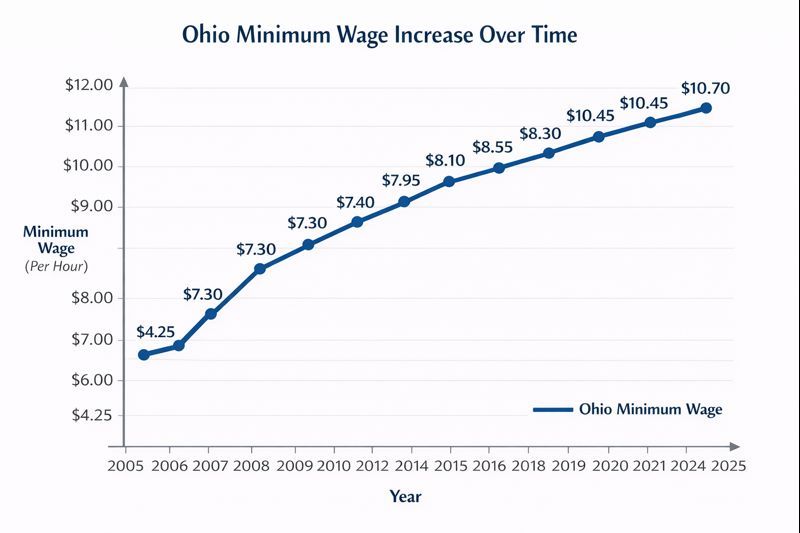Over the last several years, Ohio’s minimum wage has risen step by step, partly because of the inflation‑linking mechanism built into state law. [1][6] The state’s recent figures for non‑tipped workers at standard employers show the trend clearly: