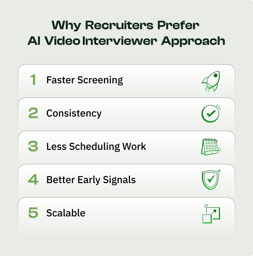 Candidates. Attend interviews at their convenience. Recruiters do not have to worry about shuffling calendars or chasing people who miss calls.