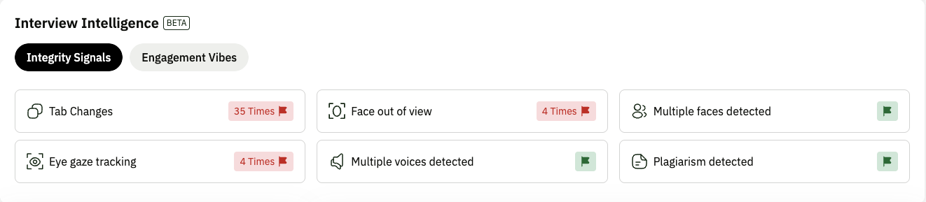Proctoring is just as strong as the AI Video Interviewer; we track 6 fraud signals in real-time: