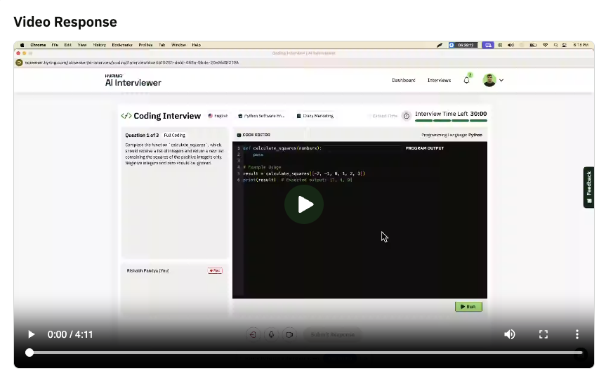 The entire session is monitored with proctoring, and you can review the code + video playback after the interview.