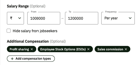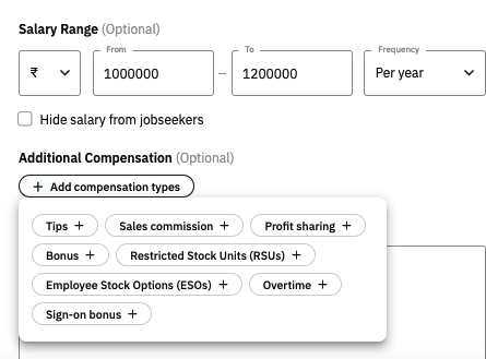 Click on it, and you'll be able to select various additional benefits or compensation options, such as ESOPs, sales commissions, and other perks you may offer to candidates.