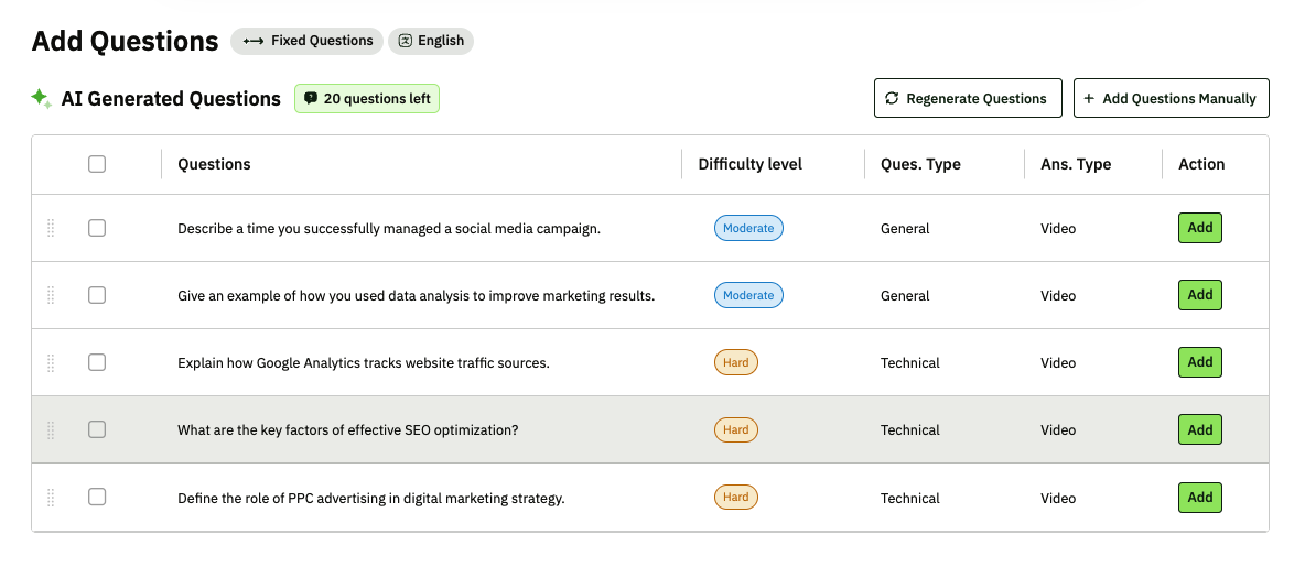 One-way Interviews: You need to manually enter the required skills. Based on this, the AI will generate the questions.