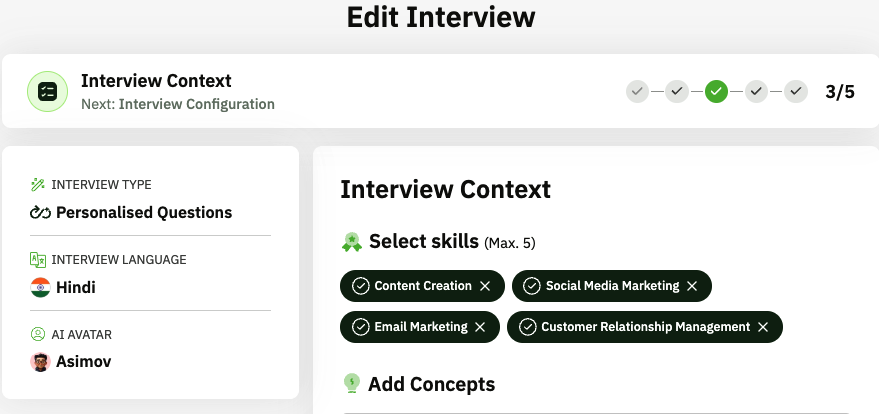 The skills and concepts you select play a critical role in the question generation. Make sure to review and get them right to ensure the questions are relevant and accurately evaluate candidates for the role.