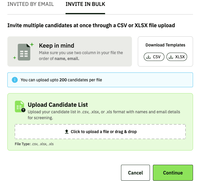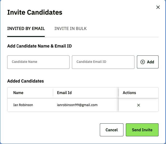 Here you can download our template, upload the list of candidates in that format, and invite them in bulk.