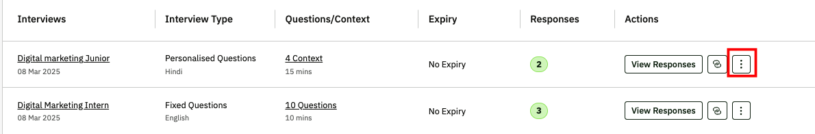 Go to the Interviews section, select the interview, and click on the three dots on the right side.
