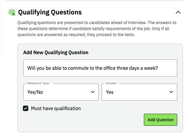You can even include Qualifying questions like, "Will you be able to commute to the office three days a week?" and put it as a must-have qualification.