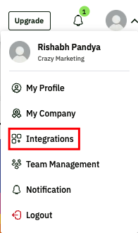 Click on the profile symbol in the top-right corner of the dashboard & Select Integrations from the menu.