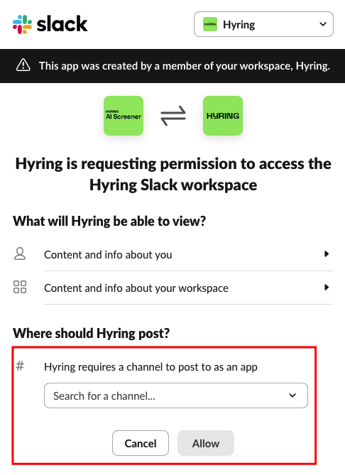 Choose your desired Slack workspace and channel and give the necessary permissions.