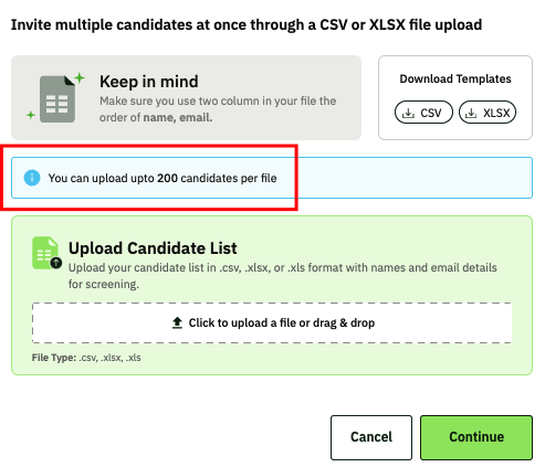 You can invite and bulk upload up to 200 candidates per file in AI Interviewer. To do this, simply download our template, fill in the required details, and then proceed with the upload.