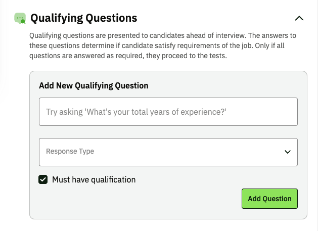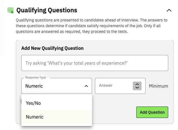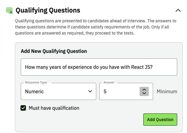 Our platform offers a "Qualifying Questions" option where you can create pre-screening questions, such as years of experience, and set preset answers.