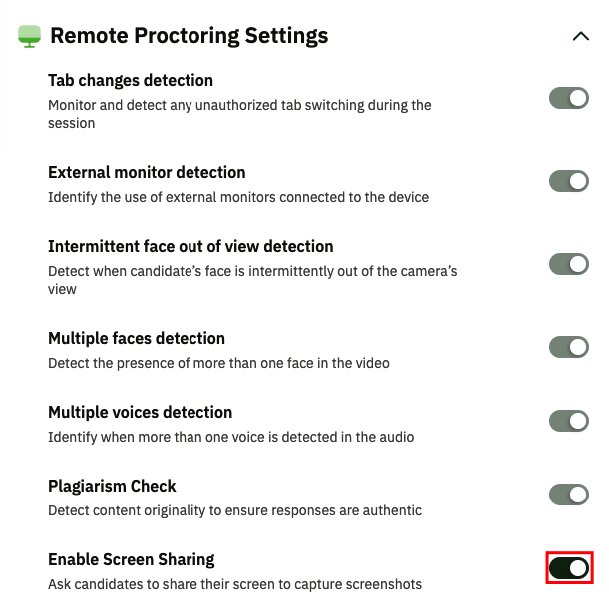 You can also include an optional feature of Screen Sharing if you want stricter proctoring to be done.