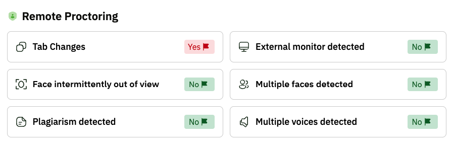 These features are flagged as green for normal behaviour and red for potential issues, such as cheating or unauthorised assistance, helping to maintain the integrity of your hiring process and eliminate fake candidates and malpractitioners.