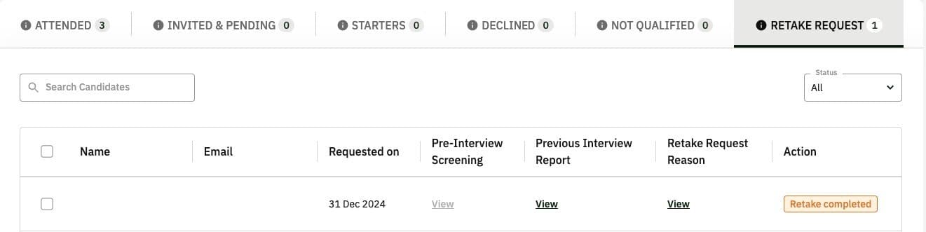 Once enabled, you can review any retake requests in your interview section and approve or reject them based on your discretion.