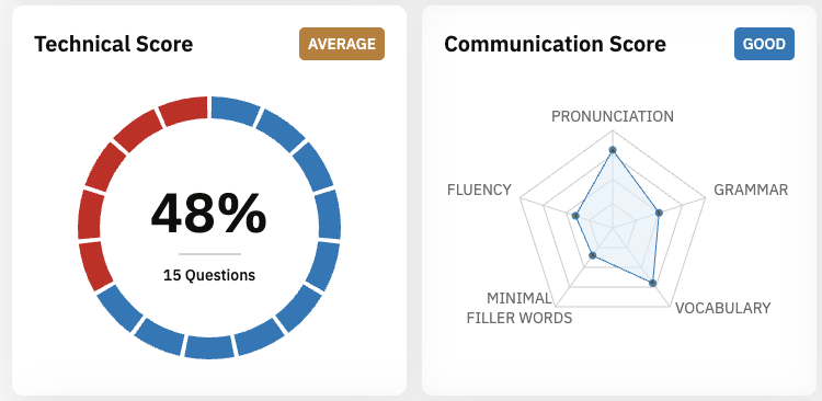 We leverage advanced Large Language Models (LLMS) to ensure the latest evaluation standards and criteria are applied. The technical score is determined based on the candidate’s answers, focusing on their depth, elaboration, and relevance.