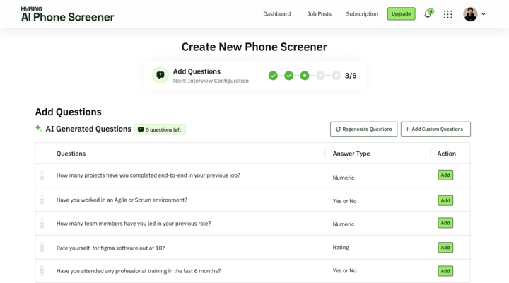 Use smart, AI-generated questions: When you create a screening, the system automatically generates a set of short, voice-friendly questions based on the job description you provide. These are designed to capture key qualifying details like experience, responsibilities, and role fit,without you having to write anything manually.