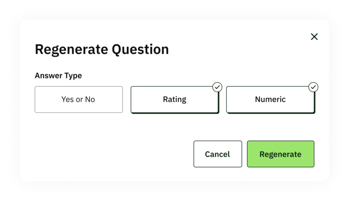 Regenerate questions: If you're not happy with the default set, you can regenerate a new set of questions with a single click. You can also choose the format (Yes/No, Numeric, or Rating) before regenerating.