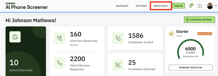 Hyring Dashboard → Subscription → Invoices