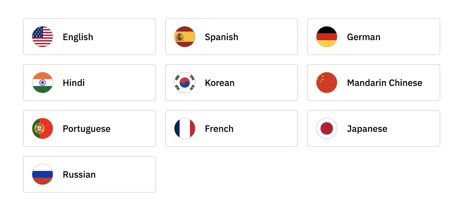 The Hyring Phone Screener currently supports 10 languages: English, Spanish, German, Hindi, Korean, Mandarin Chinese, Portuguese, French, Japanese, and Russian.