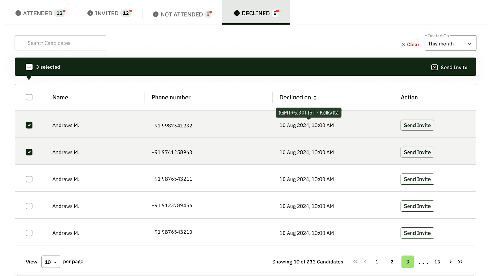 Additionally, you can visit the screening section to check which candidates have either declined or not yet taken the screening. From there, you can manually send them a reminder email,all in a few clicks.