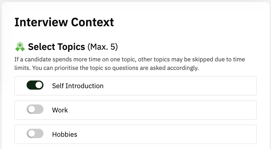 The AI will generate questions based on the selected topics during the candidate’s session.